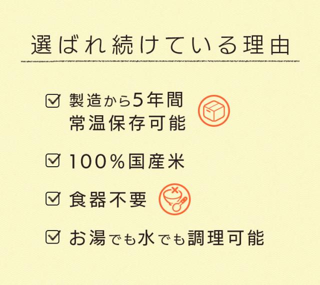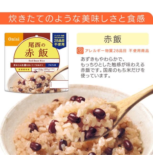 お湯を注いで20分で食べられる非常時にも心強い尾西のアルファ米!あずきもやわらかな、もちもちお赤飯。100%国産のもち米だけを使用しています。お湯でも水でもたった20分でふっくら出来上がります。ごま塩をふりかけてお召し上がりください。スプーン付きで非常時でも安心。でき上がり量はちょっと大盛り210g。市販のおにぎり(約100g)2個分ぐらいです。●内容量(約):100g(出来上がり量 210g)●原材料:もち米(国産)、小豆、ごま、食塩、砂糖、でん粉、調味料(アミノ酸等)●栄養成分(1袋 内容量約100gあたり) エネルギー:369kcal たんぱく質:9.1g 脂 質:1.3g 炭水化物:80.3g ナトリウム :234mg●賞味期限:製造より5年間(常温で保存可能)●セット内容:10袋※当商品はお取り寄せ品の為、在庫の確認及び商品のお届けまでお時間を頂く場合がございます。予めご了承くださいますようお願いいたします。(検索用:災害・防災・災害用品・備蓄・非常・非常用・非難・地震・非難用品・リュック・持ち出し・袋・セット・クラッカー・ビスケット・カンパン・ようかん・スープ・お粥・米・備蓄用保存・)