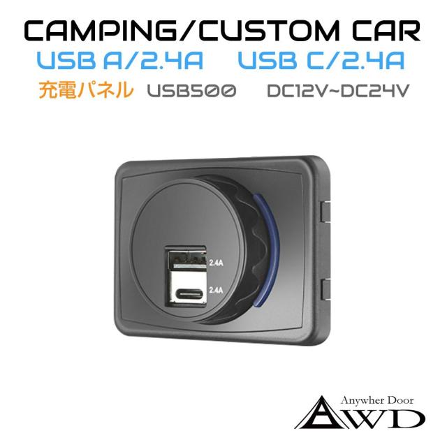 キャンピングカーパーツ シャッター付き USBパネル TypeA TypeC 5V2.4A AWD-USB500 | パネル USBポート 増設 車 充電 急速 部品 タイプA ポート アクセサリー 内装 インテリア パーツ 後付け ハイエース キャラバン エブリイ アトレー ジムニー スイッチパネル スマホ 充電