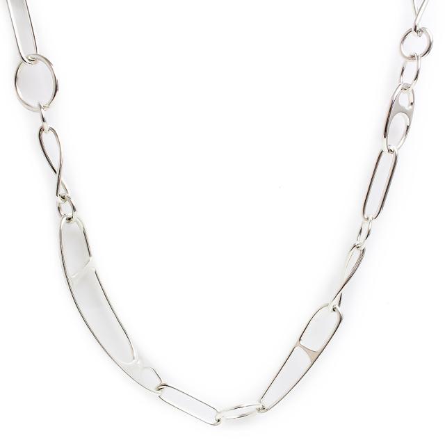 【コメント】 アンカーチェーンのリンクが伸びて安全ピンのような形状が特徴のネックレス『シェーヌ・ダンクル パンク』。エルメスの象徴的なジュエリーの現代的でロックンロールなバージョンです。大振りのモチーフが印象的で、シルバーの爽やかなきらめきが首元を華やかに飾ってくれます。色々なファッションに、そして様々なシーンでお使い頂けるネックレスです。